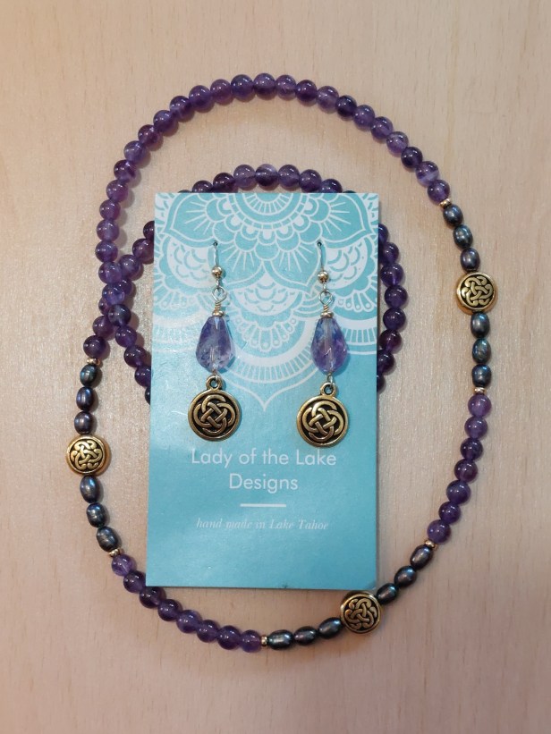 Dark Amethyst, Black Freshwater Pearl’s, Gold Celtic Accents, Gold Filled Findings. Necklace is 20 inches. 74.00