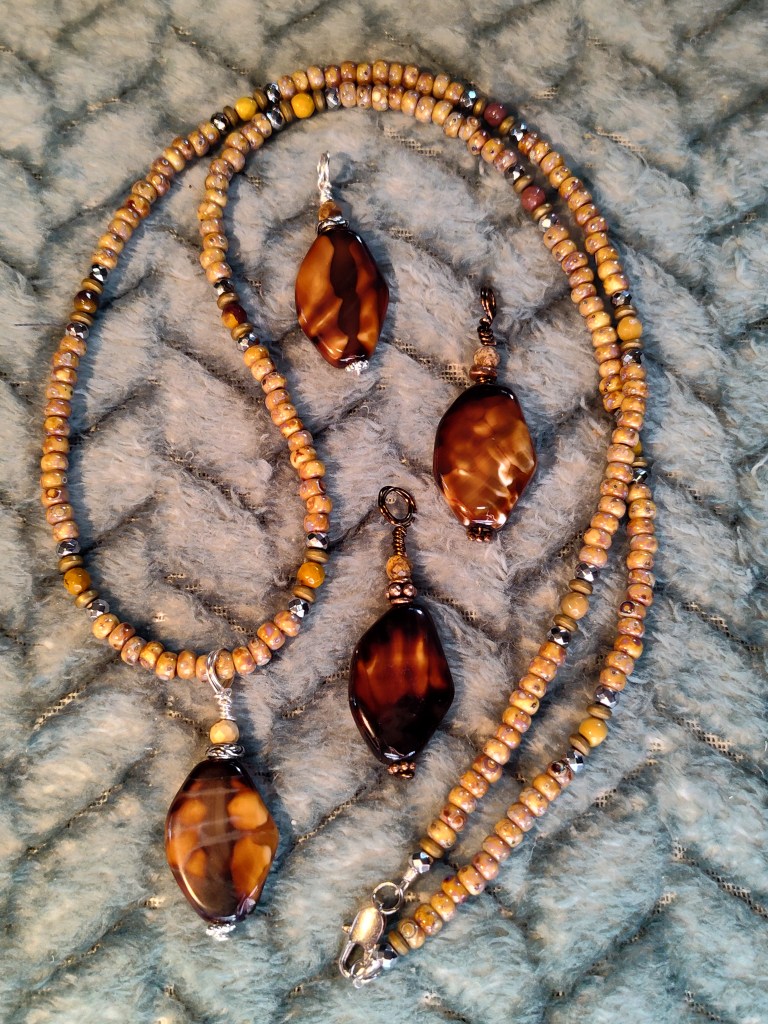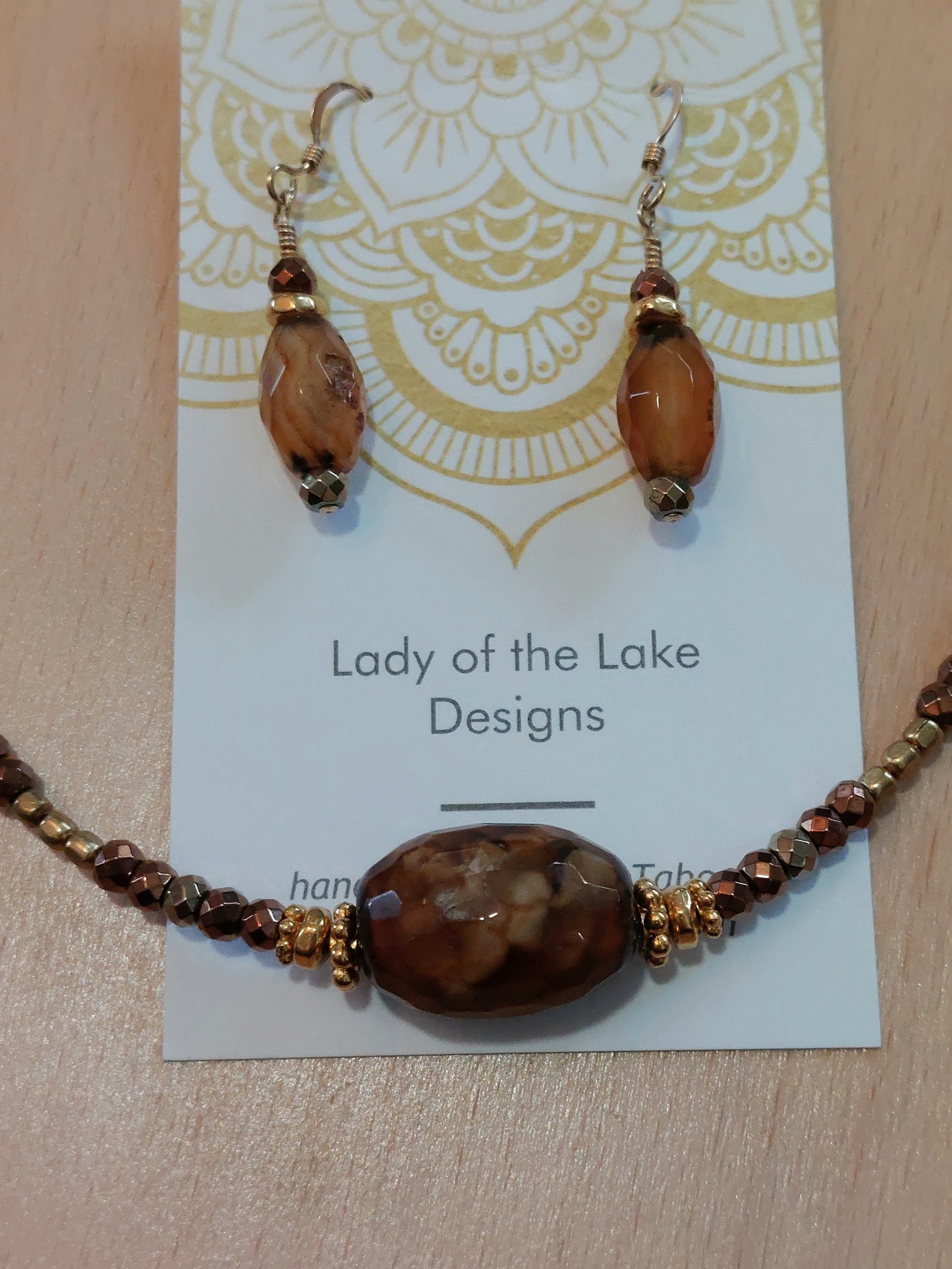 Bronze Titanium Hematite, Egyptian Gold Beads with an interesting Fossil Agate Center Bead. Gold Filled Lobster Clasp and 2 inch GF Chain Extender. Necklace is 16 inches. 52.00 Earrings are Agate Beads with GF Accents and GF Earwires. 32.00